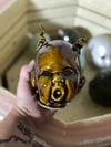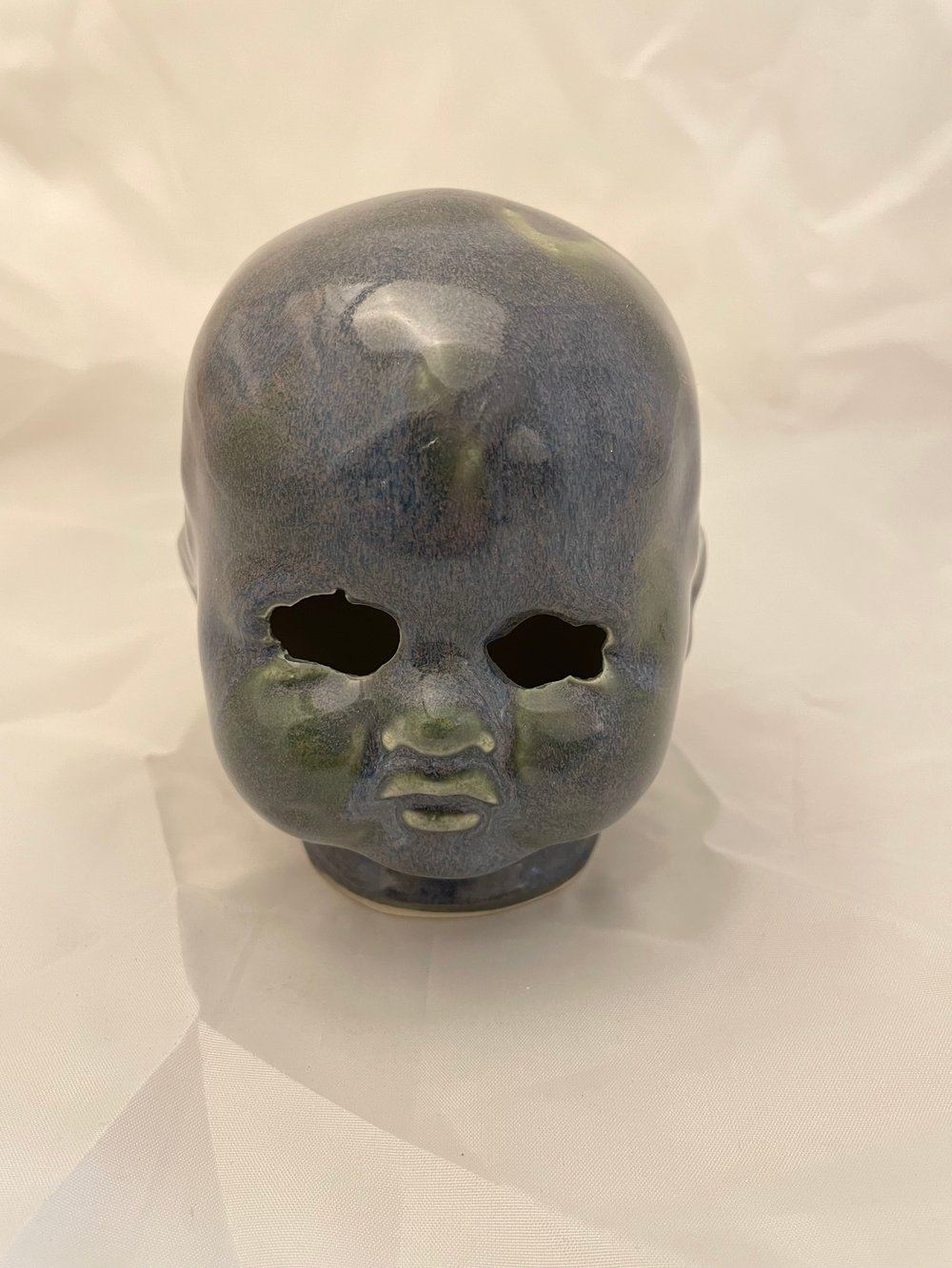 Ceramic baby head with eyes open and horns. Porcelain clay fired to cone 6 in electric kiln.